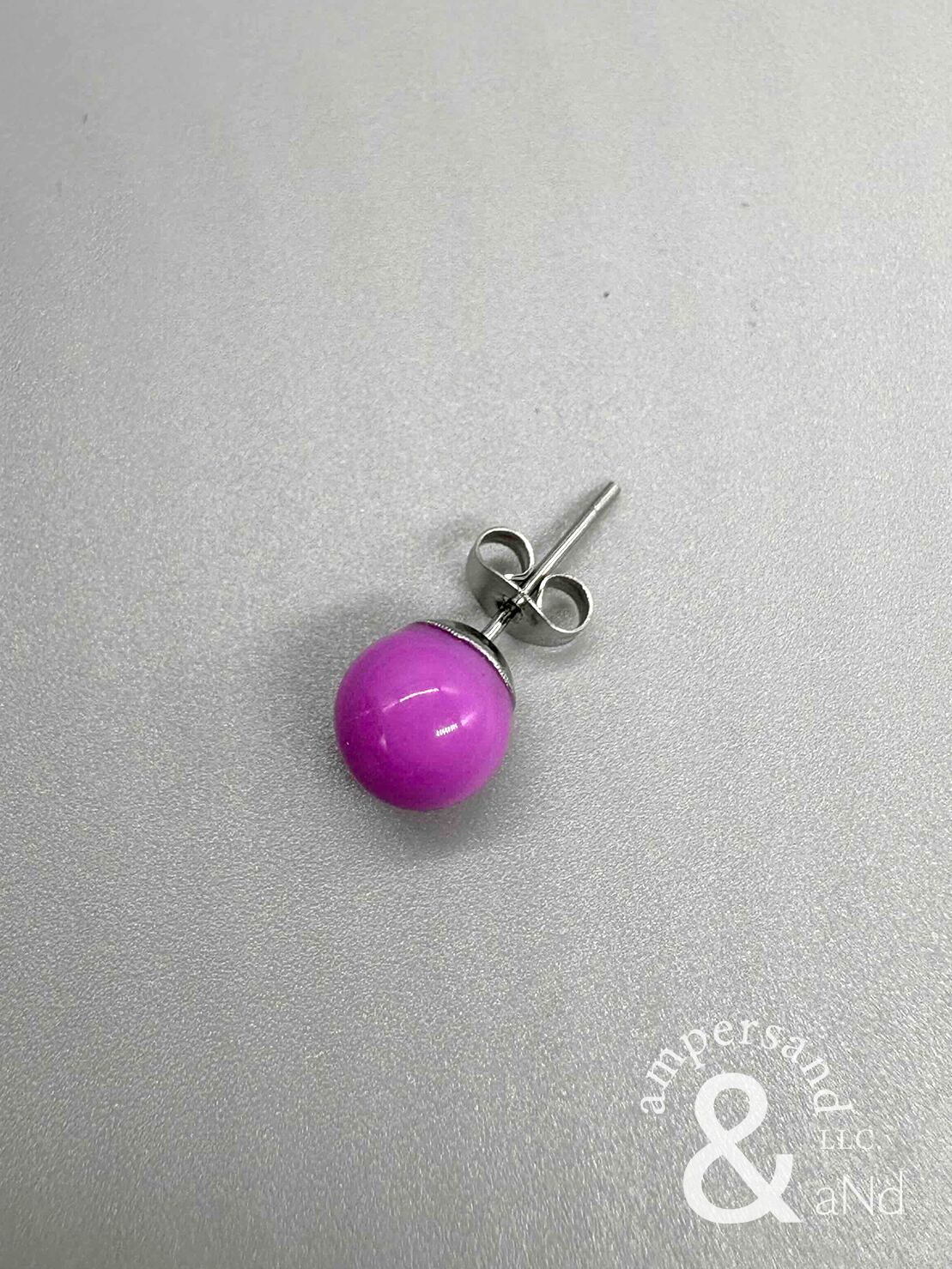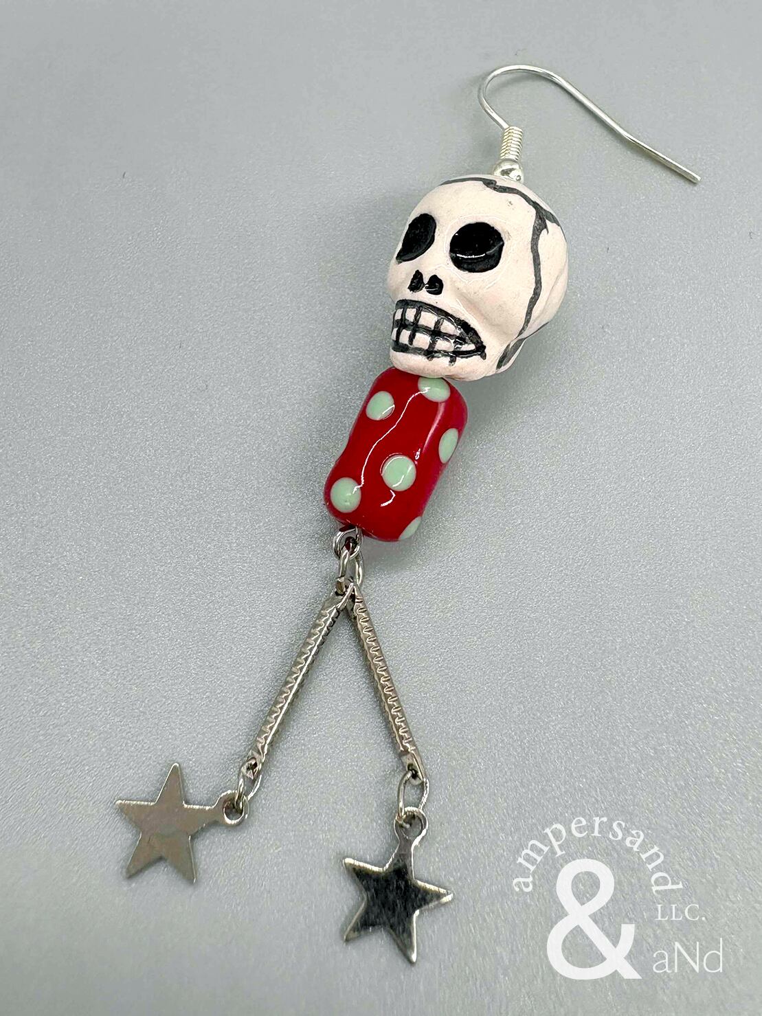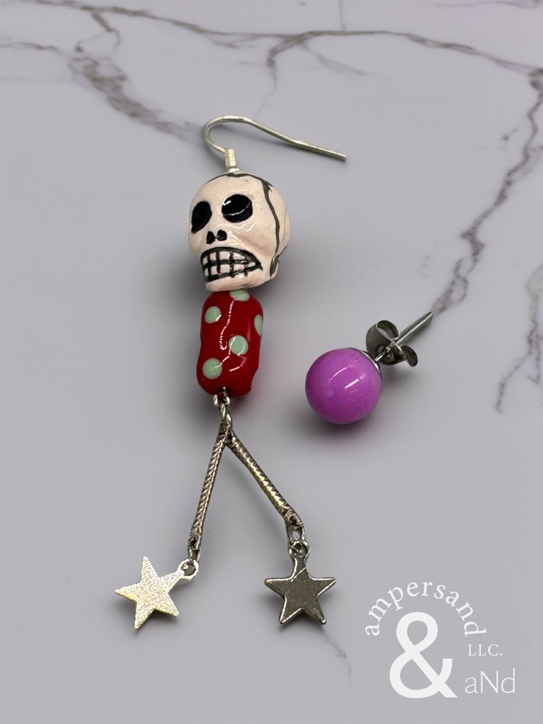 片方にはスカルモチーフと揺れる星チャーム。もう片方はシンプルなパープルビーズで、絶妙なバランスを演出しています。カジュアルにもモードにも合わせやすく、コーデのアクセントにぴったり。ハンドメイドならではの温かみとアート感を楽しめるデザインです。