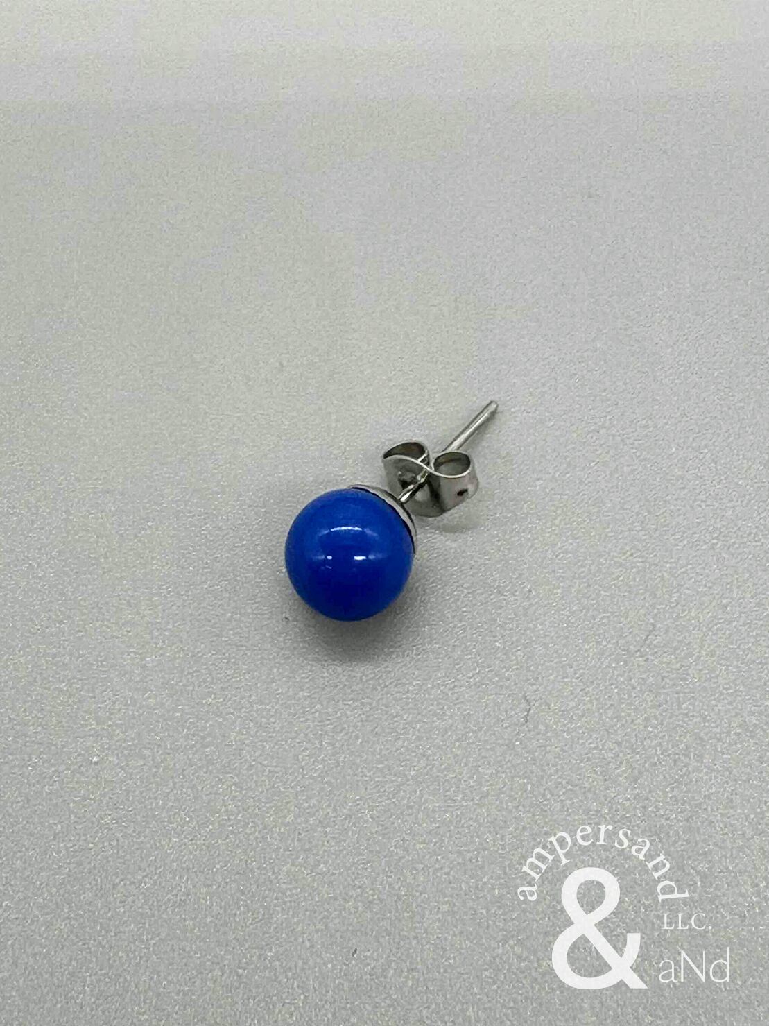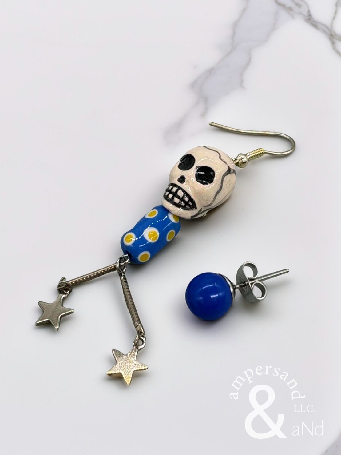 片方にはスカルモチーフと揺れる星チャーム。もう片方はシンプルなブルービーズで、絶妙なバランスを演出しています。カジュアルにもモードにも合わせやすく、コーデのアクセントにぴったり。ハンドメイドならではの温かみとアート感を楽しめるデザインです。